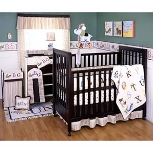 Learning your ABC’s will begin naturally for your little one as brightly colored animals, items and letters parade across this wonderful My First ABC crib bedding set by Kids Line. Set against a white background, multi-colored stripes, and rich deep brown borders, the alphabet will come alive with whimsical little friends your child will love. The beautifully appliqued and embroidered fabrics and textures bedding set includes a quilt, crib 4- sided bumper, fitted crib sheet, dust ruffle, window valance and diaper stacker. The appealingly tufted and quilted My First ABC quilt measures 36" x 45 and is made of 80% cotton and 20% polyester, exclusive of decoration. Appliqued words (Dream, Nap, Fun) and striped and brown borders decorate the bumper which is 11.25" high with single ties on each corner, and 5 sets of double ties along the top and bottom. The bumper is made of 65% cotton, and 35% polyester, exclusive of decoration, with 100% polyester fiber filling. A deep brown 100% cotton fabric (exclusive of decoration) with striped border graces the Dust Ruffle, which has a 14" drop and fits a standard size crib. The white and color-dotted fitted sheet is designed to fit a standard size 28" x 52" crib mattress. The striped with rich brown border valance measures 60" across with a 14" drop and a 3" wide rod opening. The attractive and complementing diaper stacker is 12" across and 26" down and is 8.5" deep. The My First Baby crib bedding set is practical, functional and soft to the hand, boasting Kids Line quality- a bedding set that will preserve its colors and gentle softness wash after wash. Care instructions: machine wash cold with like colors in gentle cycle, do not bleach, tumble dry low and iron on lowest setting as needed.