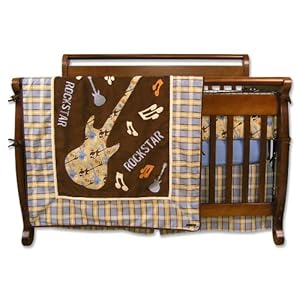 Little Rockstars will love the guitars, spatter paint, and musical note print mixed with a fun plaid in brown, blue, orange and tan. The Rockstar guitar is an embroidered applique framed on the coverlet that is backed with super soft natural Sherpa fleece. Set includes: 4 separate bumpers to fit any crib, appliqued framed coverlet that is a useful crib blanket, blue 100% cotton percale sheet with deluxe 10" pocket, 15" long box pleat skirt.
